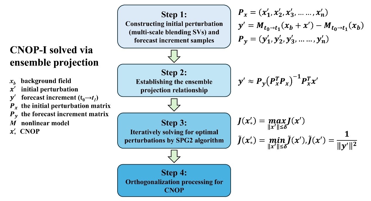 Schematic flowchart of the ensemble projection method for solving CNOP-I in the convection-allowing ensemble prediction system based on the CMA-MESO model. Credit: Hongchi Zhang.